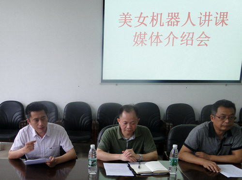 会上,党委宣传部副部长何桂林向省市媒体记者介绍了九江学院创新创业教育情况;信息学院院长邓安远介绍了信息学院对机器人上课研发进行指导、服务工作的相关情况。美女机器人讲课研发的主创人、信息学院张广顺老师介绍了美女机器人讲课创新开发的创意形成、效果展示以及前景预测等相关说明。美女机器人讲课研发团队学生成员周远明同学介绍了自己参与机器人研发过程的经历、感受和收获。