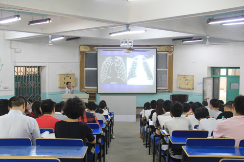 张腊喜主任运用了大量的临床影像学图片,就胸膜、肺叶、气管等X线表现和正常影像检查相关知识进行了全面的讲授。同学们聚精会神地听讲,师生互动活跃。张院长认真听课,并做了详细的笔记。