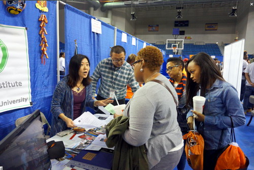 萨凡纳州立大学每年会在春、秋两季举办“校园开放日”活动,邀请全美的高中生和家长们来参观大学校园,并通过展台的方式让来参观的学生和家长与各个院系和服务部门的老师沟通交流。永利yl23411集团官网与萨凡纳州立大学合办的孔子学院是萨凡纳州立大学重要的国际交流项目,在此次校园开放日活动中,孔子学院的展台吸引了大批的美国高中生和家长来咨询。孔子学院的几位老师通过图片、视频、PPT等多种方式详细介绍了萨凡纳州立大学孔子学院和九江学院的情况,同时展示了萨凡纳州立大学孔子学院举办过的社区文化活动、汉语教学课程设置、教材、HSK考试和奖学金等项目。