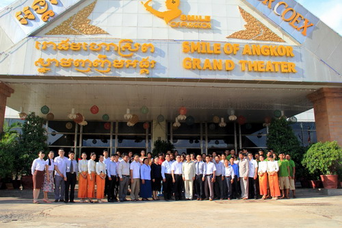 10月7日,柬埔寨王家研究院孔子学院暹粒省“吴哥的微笑”大剧院汉语中心举行揭牌仪式。孔子学院院长谢莫尼勒(H.E. CHEA MUNYRITH)阁下,暹粒省副省长金财恒阁下(H.E. KIM CHHAIHIENG),“吴哥的微笑”大剧院副书记兼副总经理傅开庭先生、副总经理钱勇先生以及暹粒省教育厅等社会各界朋友200余人参加了此次活动。