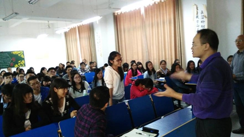 互动环节中,人力资源教师和学生纷纷发问,其中经管A1201班“学霸”彭梦涵问道:“自由职业者在家中因工作原因发生伤亡是否认定工伤?”,问题“刁钻”得令人不由发笑,算得上学生中的善问者。