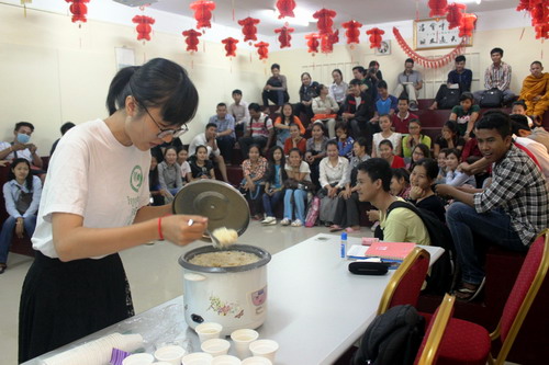 活动最后,宋老师在学员们好奇的目光中拿出了事先煮好的粥,学员们看到后全场沸腾,为老师送上了最热烈的掌声,宋老师通过提问学生柬埔寨的粥有哪些分类及熬制方法,不仅让学生了解到了中国和柬埔寨粥的具体差异,还通过分发粥让学员亲自品尝及感受到中国粥文化。