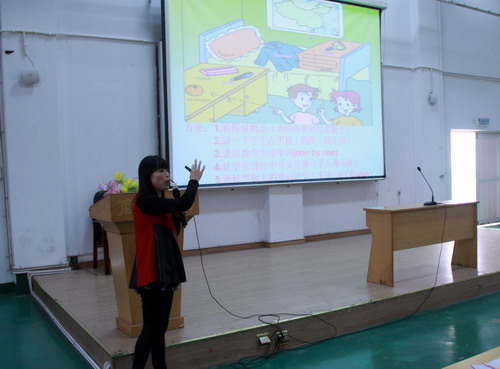 胡芬老师从事中学英语教学工作近二十年,有着丰富的教学经验。在报告中,胡老师首先阐述了自己在教学工作中“尽心尽力,问心无愧”的工作理念,强调要对每一个学生负责,要热爱、尊重、关心每个学生。然后分别以授课对象为初一和初二学生,展示了不用多媒体教学和使用多媒体教学两种不同授课方式的课例。从课前导入环节的精心设计,到教学内容的环环相扣,再到能充分调动学生学习兴趣的游戏环节,胡老师的整堂课在教学设计上构思巧妙,在教学内容上重点突出,内容紧凑,引人入胜。之后,胡老师和大家分享了自己在教学过程中的心得体会,她倡导在教学中尽量使用英语,适当使用母语;精讲语言基础知识,着重培养学生运用英语进行交际的能力;给学生创造各种语言环境,提供各种运用英语的机会,让学生充分接触英语,运用英语;提问题或组织课堂活动,机会要尽量均等,尤其要注意多给那些自卑感强的差生有表现的机会,以增强他们学习的自信心;要了解每个学生的心理特征和志向要求,有的放矢,充分调动学生的积极性。