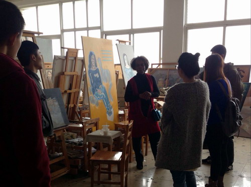 随后,一行前往参观艺术学院副院长虞斌油画工作室,Peggy教授对虞斌副教授的油画工作室作品赞不绝口,对中国艺术家的艺术产生了浓厚的兴趣。虞斌副教授介绍了他用以完成和丰富作品的外观、色泽而匠心独具的艺术处理和个人研创的创作作品。