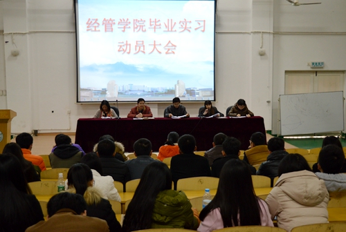 12月2日下午,经管学院在文友楼三楼报告厅召开了2016届毕业生毕业实习动员会。经管学院潘旭华院长、花金龙书记、学生科副科长郎少杰出席了会议。学院实验教学中心、学生管理科相关人员,全体毕业班班主任及2016届毕业生代表参加了会议。大会由潘旭华院长主持。