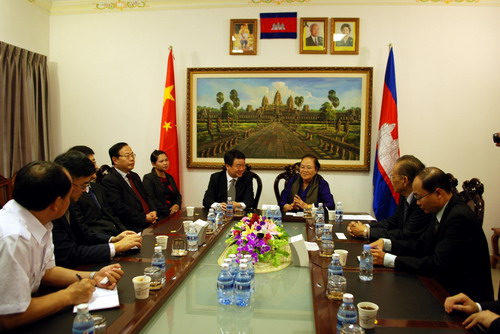 克洛媞达院士在首发式前会见了万以学局长一行,宾主进行了友好会谈。万以学局长介绍说,安徽新华发行(集团)控股有限公司每年发行销销售书籍达14亿元人民币。中国安徽黄山于1990年列入世界文化与自然遗产名录。吴哥古迹于1992列入世界文化遗产,是柬埔寨人民宝贵的历史财富与智慧的结晶。此次来访柬埔寨希望能推动中国安徽省和柬埔寨的旅游文化合作。他还邀请克洛媞达院士在合适的时候到访中国安徽省。