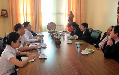 代表团一行在谢莫尼勒阁下和中方院长帅式毅的陪同下参观孔子学院并进行了会谈。谢莫尼勒阁下向来宾介绍了6年来艰辛的办学历程,孔子学院2009年只有借用的一间小办公室,2011年在柬埔寨华人华侨的支持下,有了自己的大楼;孔子学院注重文化介绍和交流,每周均会举办文化活动;在孔子学院创办之前,学汉语只是做生意人的事,柬埔寨官员对汉语和中国知之甚少,2010年孔子学院官员班的第一次汉语课是时任大使张金凤主讲的,现在我们有部分官员班汉语学员都能做翻译了;尤其是2013年亚洲孔子学院联席会议期间,洪森总理特别邀请会议在总理府大楼会议室召开,并表示会全力支持孔子学院的工作;孔子学院现有教师75名,2015至2016学年在校生逾万人,2016年孔子学院也会稳步加强硬件和软件建设,努力做好示范孔子学院的建设工作。