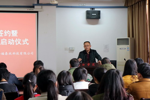 电商学院郑祚双院长代表学院对福泰欣公司给予学生创业团队的支持表示感谢,并就学院教学培养目标和创新创业教育体系做了介绍。他提到,学院一直从构建创业体系、激发创业意识、提升创业技能、搭建创业平台、培育创业团队等方面开展创业教育工作;此次与福泰欣的合作是学院为“创业团队培育计划”搭建的又一个校企合作平台,希望通过此次合作能够培养学生的创新创业实践技能。郑院长鼓励学生站在“高起点平台”上把握好机会,大胆创新,坚持不懈,勇于实践;同时也希望指导教师们能够随时跟进学生的进度,无私传授经验,加强团队与公司的联系。最后,郑院长祝愿与福泰欣科技有限公司的合作能够圆满成功,祝愿学生创业团队取得优异成绩。