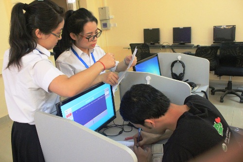 3月20日上午,2016年上半年HSKK(汉语水平考试口试)在柬埔寨王家研究院孔子学院电子语音室举行,本次参与考试的考生人数多达77人。孔子学院本部全体教师志愿者共同参与其中,为柬埔寨的考生们提供各种必要的服务,助其顺利地完成考试。