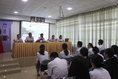 帅式毅院长对教师及志愿者的工作、生活提了具体要求。他要求,作为中柬文化交流的使者的教师们要发扬奉献的精神,教学、生活等诸多方面不要太计较,要能吃苦;要努力工作,多做调查研究,成果可供其他高校学习借鉴。针对柬埔寨教育部、亚欧大学的要求,他建议教师们要统一组织学生到图书馆学习,到孔子学院电子图书馆查询资料;可以每周在亚欧大学交流室组织一次“汉语角”活动;根据教师的特长教授学生中国象棋、乒乓球,组织观看“中国电影”等;,每周文化活动要保持,但不要占用太多课堂时间,尽可能地丰富文化活动的形式和内容。他还对志愿者的安全保卫及新闻写作提出了具体要求。