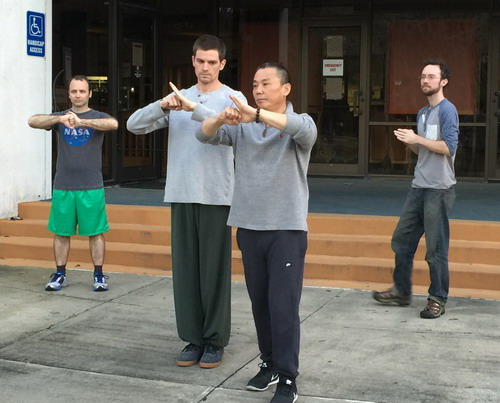 在萨凡纳州立大学图书馆楼前,梁亚强老师带领学员们一起练习“五步拳”、“二十四式太极拳”等中国功夫。梁老师教得仔细,学员们个个都学得认真。