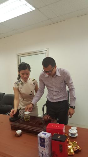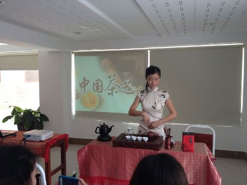 首先,席老师通过PPT展示和讲解了茶的起源,然后用图片展示了中国茶的主要分类及中国十大名茶。在讲到乌龙茶时,席老师说,乌龙茶是中国特有的茶类,主要产于福建、广东和台湾。关于乌龙茶的得名,有很多说法。其中一个很有意思的传说,说最先发明该茶制作方法的人名字叫苏龙,因人长得黑,人称乌龙,所以茶因人而得名。讲解过程中,席老师一边用通俗易懂的语言告诉学生十大名茶,一边用现场事先准备好的茶给学生做示范。学生对安溪铁观音比较熟悉,很多学生都表示自己曾品尝过铁观音,现场了解到铁观音属于乌龙茶类,是中国福建安溪出产的一种非常有名的茶。