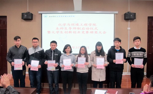 3月30日下午,化环学院在向学楼201隆重召开化环学院本科生导师制启动仪式暨大学生创新创业技能竞赛颁奖大会。学院党委书记刘新强、院长严平、副院长孙德四、曹小华、学院全体教师及2015级本科班全体同学和大学生创新创业技能竞赛的获奖者参加本次会议,会议由严平院长主持。