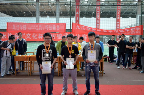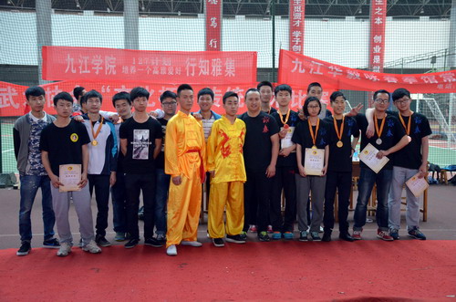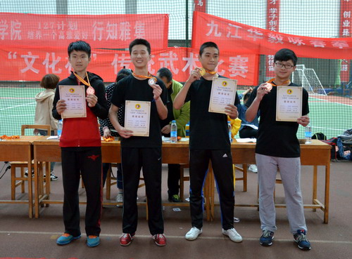 当参加比赛的选手在会场中检录后,武术赛事竞赛——“文化杯”传统武术比赛活动正式开始。赛程共分:规定基础套路,传统套路和器械组三个大类八个小组,在接下来的一个多小时中,参赛选手为大家展示了五步拳,十步拳,咏春拳,长拳和双截棍三段刀术等内容。比赛由三届国际咏春擂台赛冠军,九江华毅咏春拳馆馆长陈则华老师和九江学院学生社联武术协会会长张鹏任裁判长。赛后,在工作人员计算成绩的时间中,陈则华老师为大家示范了咏春拳在二人对战中的作用,张鹏会长也为大家表演了八极拳。经过激烈的竞争,刘刚,刘雪萍,缪世杰和陈文涛等人获得本届“文化杯”传统武术比赛小组冠军。会后,所有参赛选手与裁判员合影留念。