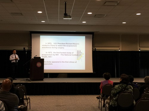 刘一凡博士以针灸术在美国的发展历史作为讲座的开篇,介绍了针灸术在美国的应用和取得的成效。他尤其介绍了针灸术所蕴含的中国传统文化中的阴阳学说和五行相生相克学说的哲学思想,指出了中医理论中“和”、“气”对于健康的重要意义。在讲座的现场不时有听众提问,刘博士一一详细做出了回答。