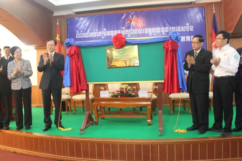 4月25日,柬埔寨王家研究院孔子学院马德望省国际大学汉语中心揭牌仪式在王家研究院举行。正在柬埔寨访问的中国贵州省委书记陈敏尔、中国驻柬大使馆大使布建国、柬埔寨教育青年体育部国务秘书约克诺伊(H.E. YUOK Ngoy)、柬埔寨王家研究院副院长逊春文院士(H.E. SUM Chhum Bun)、孔子学院院长谢莫尼勒阁下(H.E. CHEA Munyrith)、中方院长帅式毅、中国贵州省教育代表团、柬埔寨政府官员、孔子学院师生及当地大中学生代表等300余人出席仪式。