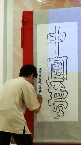 孔子学院学员湄公大学选手陈伟盛表演一笔书法“中国梦”