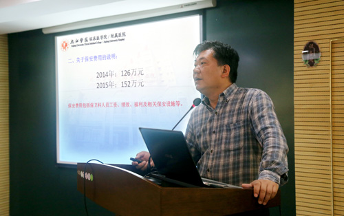 5月30日上午,九江市城市公立医院综合改革基线调查组来临床医学院/附属医院开展调查工作,市卫计委调研员郑东升带队,市财政审计部门、市编办、市医保局、市卫生计生委体改科及医政科等相关部门一行 15人,对临床医学院/附属医院综合改革基线自查数据进行调查与核实,了解医院工作服务成本、服务能力和医院运行方面存在的问题。
