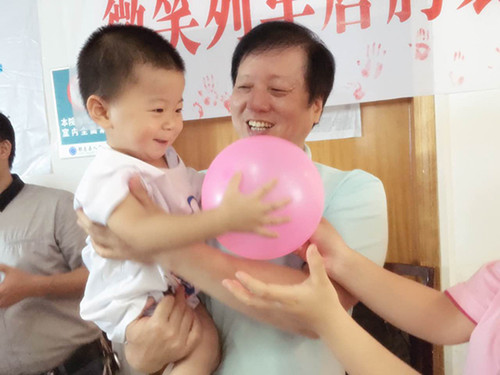 在“微笑列车”爱心培训现场,张志平院长与康复患儿逗乐