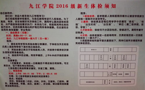 为了全面贯彻落实国家教育部颁发的《全国学校卫生工作条例》、《普通高等学校学生管理规定》,根据江西省《关于规范全省大中学校学生健康体检项目及费用标准的通知》(赣教体艺字【2011】32号)和《九江学院学生管理规定》的要求,在学校的统一安排和部署下,在党院办、学生处、团委、后勤管理处、各校区和各二级学院等单位的大力支持下,永利yl23411集团官网2016年级学生入学体检复查工作于2016年9月8日早上6:00拉开了序幕。