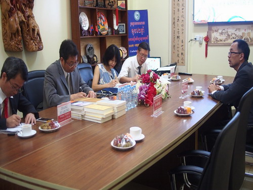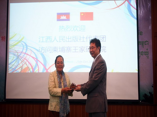 10月25日下午,在社长张德意的带领下,江西人民出版社代表团一行4人访问了柬埔寨王家研究院孔子学院。柬埔寨王家研究院院长克洛媞达院士(Academician KHLOT Thyda)、孔子学院院长谢莫尼勒阁下(H.E.CHEA Munyrith)、中方院长夏修龙教授会见了客人。