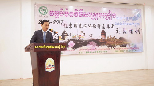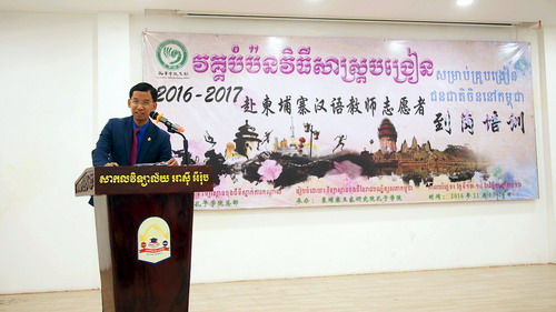 11月13-14日,由孔子学院总部主办、柬埔寨王家研究院孔子学院承办的2016-2017年度赴柬埔寨汉语教师志愿者到岗培训会在柬埔寨首都金边举行。柬埔寨教育、青年、体育部副国务秘书斯雷奇姆尼峰(SEREI Chumneas)、中国驻柬埔寨王国大使馆政治处主任程洪波及柬华理事总会、亚欧大学等领导出席,来自柬埔寨15个省市、46个教学单位的218名汉语教师志愿者参加了培训。