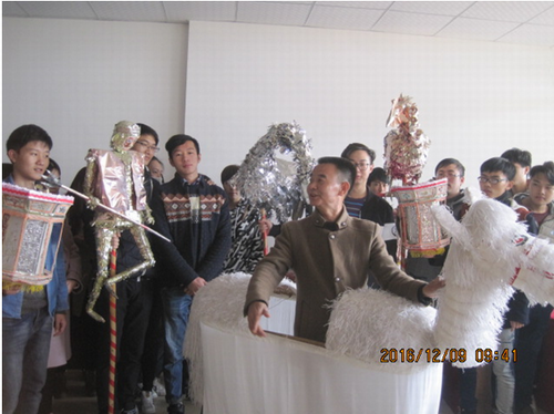 最后,民间艺人来到九江学院非物质文化遗产陈列馆,给学生演示这种不需要舞台与幕布民间艺术,同学们意犹未尽的沉浸在表演艺术之中。