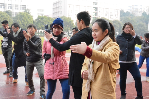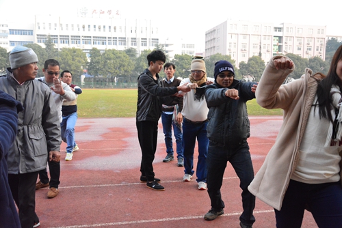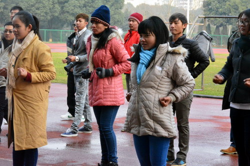 12月22日上午,体验团成员来到南区田径场,学习中国武术。经过一段热身之后,来自体育学院的两个教练开始带领大家学习南拳。一招一式,一拳一脚,都让体验团成员们新奇赞叹不已。成员们高涨的热情,让老师也更加认真地指导和纠正大家的动作。经过一个多小时的学习,成员们也能成功地演示出一套流畅的拳法,让老师大为称赞。