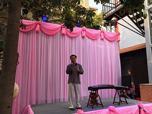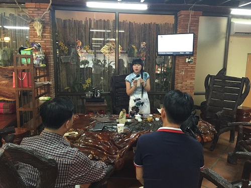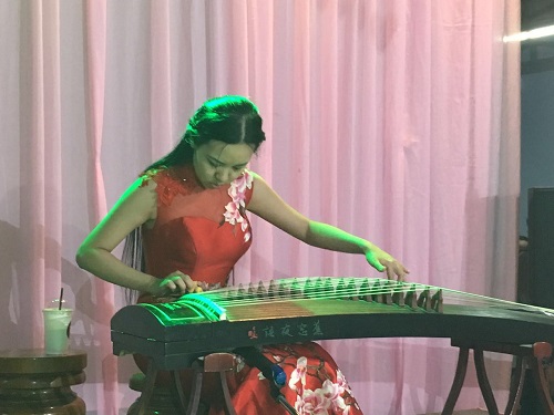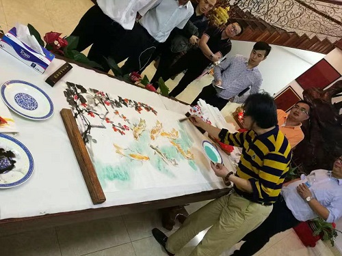 黄庆辉教授现场作画,一幅榕江土鲤鱼画作,充满韵味,一解游子的乡愁。孔子学院黄书、田唱和黄楷讯三位志愿者教师分别向各位嘉宾展示了茶艺、古筝和书法艺术。黄书老师在展示茶艺的同时,给各位嘉宾讲解了中国茶类、中国茶礼仪、茶的历史及其功效等等,各位嘉宾在温婉柔和的气氛中享受茶的芳香,感受中国茶文化;田唱老师现场弹奏了《渔舟唱晚》、《琵琶语》等经典古筝曲目,灵动的旋律、清脆的乐声把现场仿佛带入了古典乐坊,大家沉醉其中;黄楷讯老师现场挥毫泼墨展示书法,赢得现场好评不断,不少嘉宾请求黄楷讯老师题字。现场艺术气息浓厚,在新春佳节给各位嘉宾营造了闲适雅致的氛围,整个交流活动于轻松柔和的氛围中进行。(黄书)