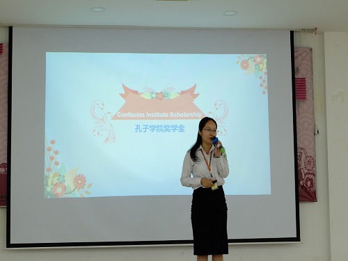 户社芳老师就HSK和HSKK考试用途、报考流程以及近期的考试情况为同学们做了详细的介绍。欧阳娟老师为各位同学具体说明了本次孔子学院奖学金的类型、资助标准、申报流程和所需材料。