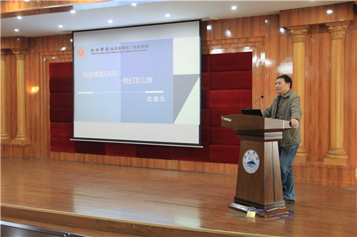 当天下午,麻醉科还在行政办公楼九楼会议室,开展了麻醉科普讲座。麻醉科沈国生主任为全院医护人员、临床医学院高年级学生开展了以加速康复外科(ERAS)为主题的学术讲座,给大家带来最新的麻醉医学理念。