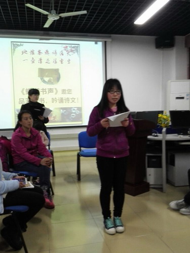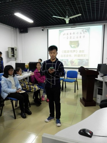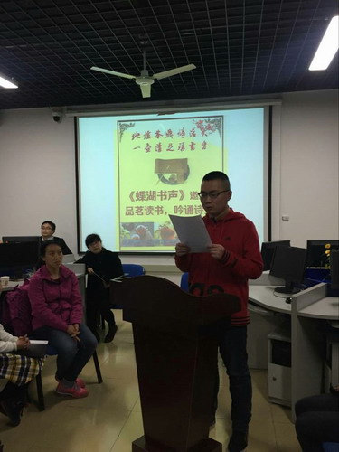 朗读会在土建学院秦华康同学带来的慷慨激昂的《九江赋》中拉开序幕,诚如他所说的:后学子弟,来自九州,缘分所致,齐聚九江宝地,江西名府,白鹿书香,一展斯地尽美!