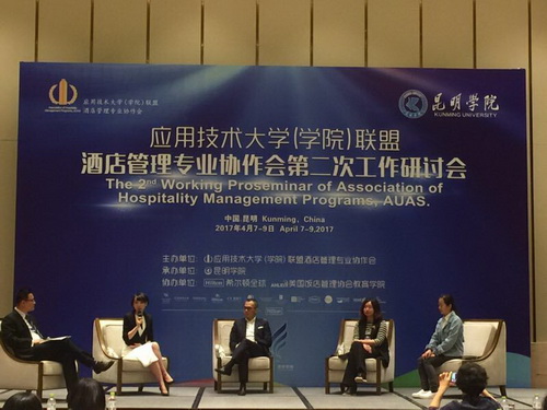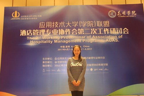 4月7日-9日,旅游与国土资源学院酒店管理专业负责人李晓丹老师赴云南昆明学院参加应用技术大学(学院)联盟酒店管理专业协作会第二次工作研讨会。云南省教育厅高教处处长卢明,教育部高校旅游管理类专业教学指导委员会主任田里,昆明学院校长黎素梅,华侨大学旅游安全研究院院长郑向敏,云南省旅游业协会副会长赵国雄以及全国70余所高校酒店管理专业的专家学者、美国饭店协会代表和酒店管理行业高管出席了会议。