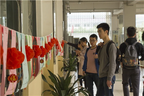 活动开始不久便陆续吸引住了一大批学生,现场人头攒动,猜谜的同学或是低头思考、或是交流探讨,无一不投入到五花八门的灯谜当中。在现场可以看到,有的同学在为自己猜出谜题斩获奖品而欣喜不已;有同学走马观花,只是略微看看谜面;也有同学则细盯着谜面蹙眉凝思,绞尽脑汁作答。据职工灯谜协会会长说,此次700道谜题主要围绕古今中外名著出题,如果说平时缺少阅读量,对诸多作家及其作品都不了解的话,要猜出谜底就有一定难度了,也难免有些同学猜起来稍感艰涩。另外他还说到猜谜还要有一定章法,猜谜十八法,谜面设计太过玄妙,要真正猜好谜可谓要“上知天文,下知地理”。这不,来自信息学院徐金峰同学和八里湖校区的一等奖获得者——政法学院彭怀鹏便是很好的例子,爱好文学、拥有丰富阅读量的他们,在这次灯谜展猜中显然占据了上风,顺利猜出了十几条灯谜。