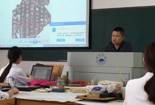 曹端阳老师通过PPT演示的形式向我们讲述古代和当代的各书法大家的书法演变历史,以及他们的用笔特点和在不同载体上展现出来的形式丰富的字体,强调在临摹时通过对比等方法更好地理解书法艺术特点。曹老师还向我们重点介绍了书体的章法和形式语言,使大家对书法创作有了更加深刻的认识。