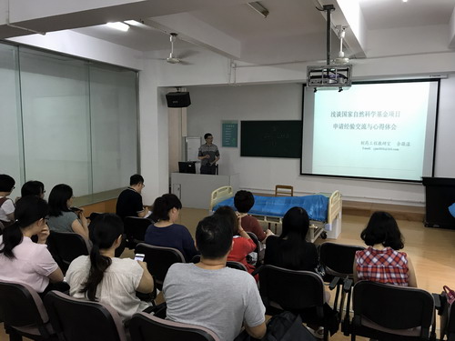 报告分两个阶段进行。余敬谋博士先就国家自然科学基金项目申请、江西省自然科学成果奖申报以及指导大学生竞赛三个主题详细介绍了自己的工作经验与心得体会。余博士用“准、精、实、细”四个字概括自己写作国家自然科学基金项目申请书的心得体会,即研究点要准、研究内容要精、研究成果要客观、写作要细致。余博士用“关键是动手”总结自己的研究经验和过程,与参会教师共勉。报告后,与会老师与余博士展开热烈的交流,大家就申报课题中遇到的问题、申报注意事项、如何选拔参赛学生等讨论交流与汲取经验,余博士给予耐心细致的解答。报告取得预期效果。