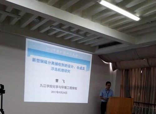 会议期间,化环学院3位老师就各自的研究方向,与北京矿冶研究总院、中南大学、北京科技大学、东北大学、江西理工大学等科研院所的专家学者进行广泛交流。曹飞博士应邀在选矿药剂分会场做了题为“新型铜硫分离捕收剂的设计、合成及浮选机理研究”的学术报告,并就高效、绿色、环保选矿药剂的设计合成,和与会专家进行了深入探讨。