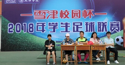 随后,裁判员代表及运动员代表分别进行了庄严宣誓。体育学院院长王勤老师为“雪津校园杯”2018年足球联赛开球。