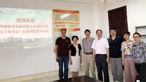5月24日上午,河南财政金融学院韦伯国际学院党总支书记王士伟、副院长马卫寰、办公室主任王德厚、辅导员王萍一行来到经济与管理学院,就中外合作办学问题及国际教育交流开展情况等相关工作进行调研交流。经管学院院长项益才、党委副书记刘羲之、学生科副科长李颖萍以及负责中英合作办学的陈正老师一同参加了会议。