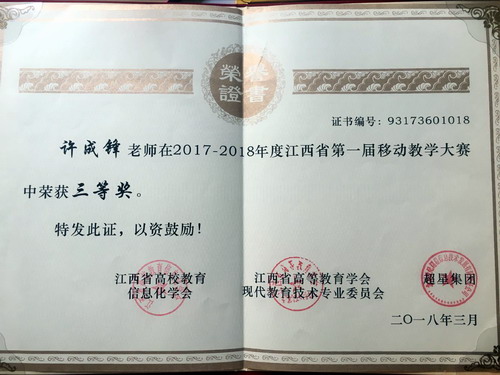 本次大赛由江西省高校教育信息化协会、江西省高等教育学会现代教育技术专业委员会主办,全省共有42所高校、300多位教师、320门课程参赛。大赛分为数据评比、专家评审两个赛段。在数据评比赛段中排名前30的教师顺利晋级第二赛段。最终,大赛评出一等奖3项、二等奖7项、三等奖20项。