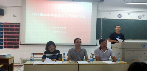 为了做好2019届本科毕业论文工作,根据学校相关文件精神和实验中心要求,电子商务学院于9月5日下午在竞秀楼501教室召开2019届本科毕业论文工作启动大会。郑孝庭副院长,论文指导老师和电商A1501-A1503班全体同学参加。会议由实验室主任陈显章主持。