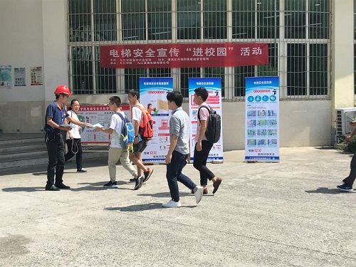 为认真贯彻落实《江西省特种设备安全条例》,深化特种设备安全专项整治行动成果,强化电梯使用单位安全主体责任意识,扎实开展电梯安全宣传,提高社会各界对电梯安全工作重要性的认识、理解和支持,营造全社会“关爱生命、关注乘梯安全”的舆论氛围,根据《省质监局办公室关于组织开展全省“电梯安全宣传周”活动的通知》要求,由九江市质量技术监督管理局主办,濂溪区市场和质量监督管理局协办,永利yl23411集团官网和九江美奥电梯有限公司共同承办的“电梯安全宣传进校园活动”于9月20日上午在学生三食堂门口成功举办。