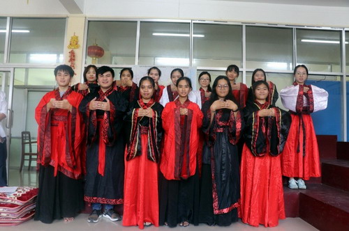 上午十一时,孔子学院肖悦老师和许梦杰老师带领十二名身穿传统汉服的4B班学生,在宽阔明亮的27教室席地而坐围成圆圈,形成了一个小小的“孔子课堂”。肖悦老师向学生们讲解了孔子的生平,包括其周游列国的故事和撰写典籍的伟绩,在座的学员无不对孔子产生由衷的敬仰之情。许梦杰老师则向学生们讲解了《论语》里的传统礼仪,她结合自身的教学经验和学生的学习生活,创设了一个又一个生动的情境,再现了孔子杏坛讲学的场面。随后,两位老师带领学生诵读《论语》中的经典语句,教室里琅琅的读书声,让人一下子穿越历史,回溯到那庄严肃穆的春秋殿堂。课程结束后,两位老师又向学生示范了传统的“作揖”礼仪,学生们纷纷效仿,并依次向老师、同学行拱手礼。为检验学生们短短一小时的学习成果,两位老师专门设计了最后的“有奖竞猜”的环节,并提前准备了精美的小礼品作为奖品。最后,两位老师和全体学生向“至圣先师”——孔子行鞠躬礼,表达了对孔子的尊敬之情。