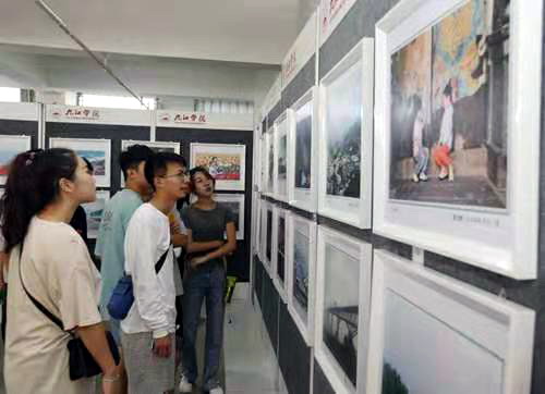 24日上午,学校庆祝新中国成立70周年“我和我的祖国”师生书画摄影展在逸夫图书馆开展。