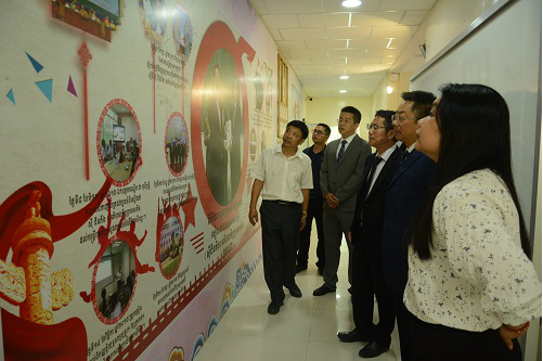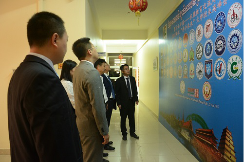 会后,在柬埔寨皇家科学院的各位领导和孔子学院两位院长的带领下,中柬双方来到芳华大楼三楼进行示范基地的揭牌仪式,最后双方在友好的氛围中合影留念