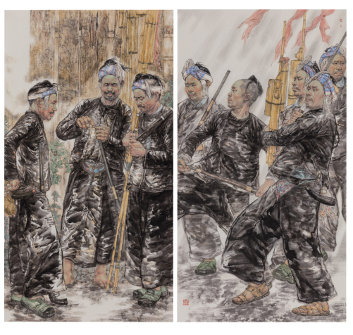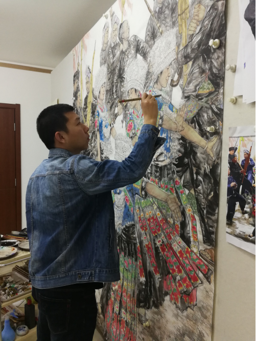 刘老师入选的作品体现的是他在黔东南乡村采风过程中所见景象。春月里的苗乡一片春意生机,绿装又回苗乡行间。这里远离城市的喧嚣和浮华,人们回归最自然的生存状态。此时苗乡人们开始盛装出行,姊妹节、爬坡节、斗牛、斗鸡、对山歌、吹芦笙等庆祝活动不胜枚数让人好不欢乐,庆祝今年有好的年景。