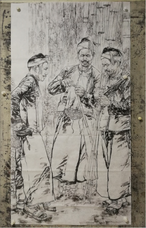 暑假期间,刘老师在得知此次展览消息后,便立即投入到紧张的画展筹备工作中。为了此次参展,他从收集适合绘画题资料到定型构图,几次易稿前前后后用了半个月的时间,最终确定用在贵州黔东南乡村写生过程中收集的资料。