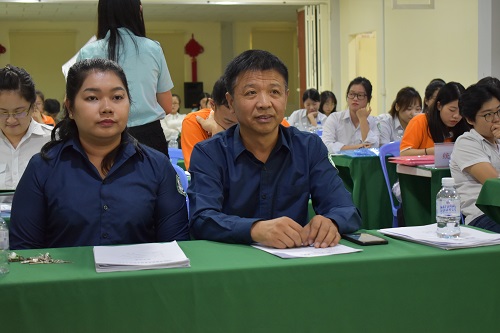 2019年11月10日下午,为进一步提升孔院课堂教学质量,提高汉语教师志愿者的教学水平,促进教师们相互交流和学习,柬埔寨皇家科学院孔子学院在孔子学院本部三楼会议室隆重举办了一年一度的孔子学院汉语教师志愿者教学竞赛。柬埔寨皇家科学院孔子学院中方院长柴克清先生和柬方院长苏碧娜(VUTH Sopheakna)女士莅临本次教学竞赛现场,来自孔子学院本部及下属各教学点的60名汉语老师参加了此次活动。