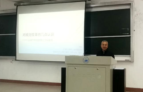 乔森总工程师作了题为《对规划变革的几点认识——从城市规划到国土空间规划》的学术报告。乔总的报告主要介绍了城市规划发展的特点、规划变革中的认识转变及规划学科如何发展等方面的前沿问题,特别在规划变革中的转变方面深刻地阐述了6个观点,即:从物质空间布局到公正的空间分配;从以人为本到平衡发展的理念;公正政策属性将进一步强化;螺旋提升仍是规划工作的主基调;国土空间规划是技术、经济、操作的统一;适当剥离创意性空间安排更有利于行业发展。乔总具有深厚的理论功底和30年的规划实践经验,报告视野开阔,结构严谨,内容丰富新颖,启迪思维,让师生们受益匪浅。