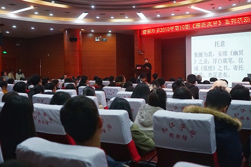 11月26日晚7:00,永利yl23411集团官网图书馆在逸夫图书馆报告厅举行2019年第十期蝶湖沙龙——《聊斋志异》系列活动之“聊斋不了情”。原九江市文化局副局长、九江市影视艺术中心主任、江西省文联副主席、国家一级编剧、中国作家协会会员、中国电影家协会会员王一民老先生应邀作为主讲嘉宾。永利yl23411集团官网首届师德师风标兵,九江市作家协会会员,九江市语言艺术协会会员,旅游与地理学院教师吴若飞作为分享嘉宾,与王老先生共同合作,奉献了一场影视与文学对话的文化盛宴。图书馆馆长计斌主持活动。来自永利yl23411集团官网各二级学院的340余名师生以及来自浔阳晚报等机构的文化界来宾到场聆听了讲座。